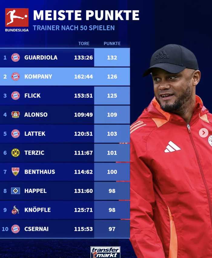 对比来看,孔帕尼在自己执教德甲的前50场联赛中拿到了126个积分,在主帅中排名第二,当然排名第一的正是他的恩师瓜迪奥拉。由此可以看出其跟瓜帅的学习是多么成功,这也是证明了瓜帅眼光。孔帕尼不仅仅是一个好队长,也是一个教练的出色人选。在之前的各类公开场合,瓜帅也是多次表达了类似的观点,看来他对孔帕尼的支持可不仅仅是客套,这个新主帅的确是具备很好实力的,这也是拜仁接下来的机会。
